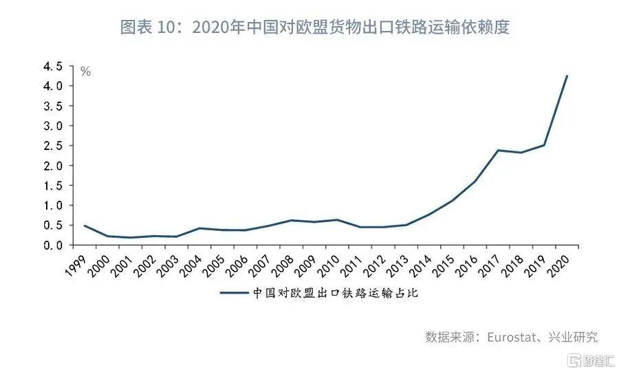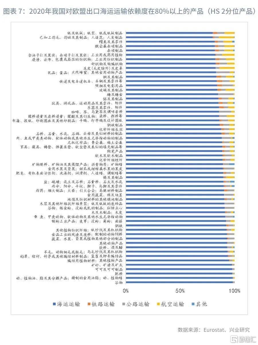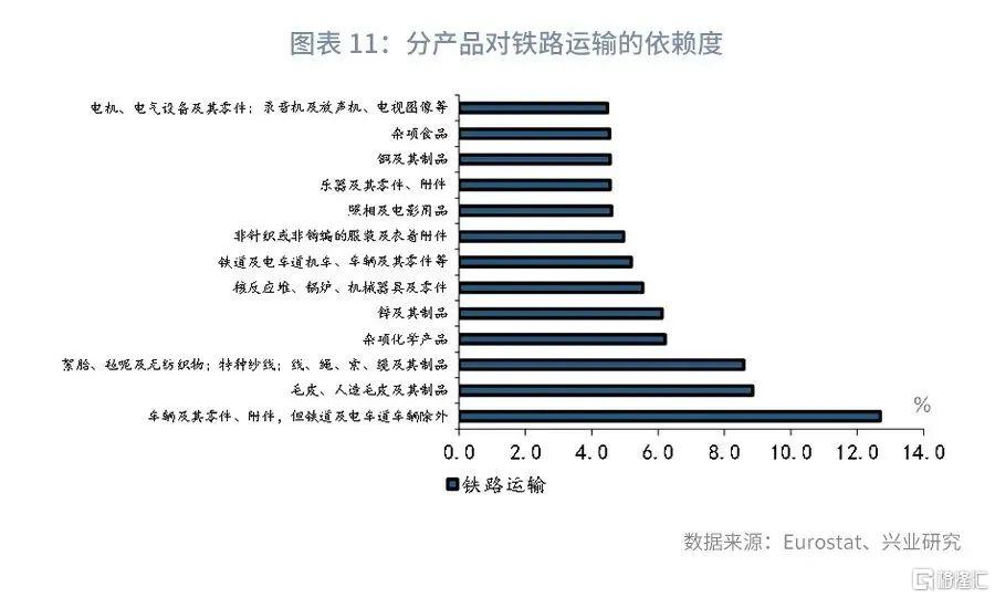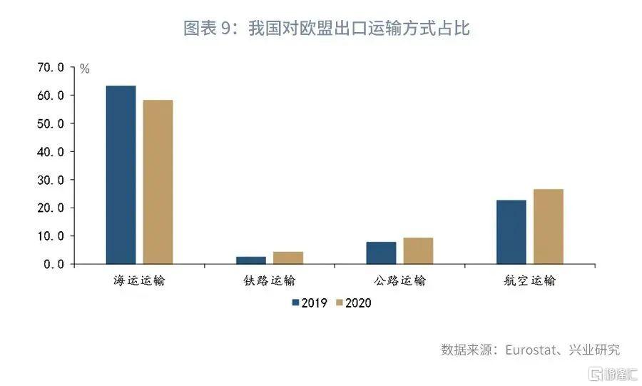 需要指出的是,伴隨海運運輸成本上升,部分產品運輸方式由海運運輸開始轉向航空、鐵路、公路等方式。數據顯示,疫情爆發以後,我國對歐盟出口重,鐵路運輸、公路運輸及航空運輸佔比分別上升1.7、1.5和3.9個百分點,參見圖表9。這意味着,對鐵路運輸、公路等運輸依賴度較高的貨物,其受海運運輸不暢影響也相對較小。具體而言: