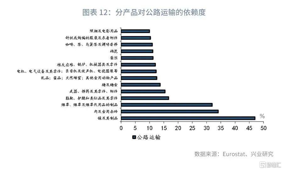 從公路運輸來看,公路運輸有機動靈活但運量小的特徵。2020年,我國對歐盟出口的公路運輸依賴度為9.3%。其中,約有46.9%的鎳及其製品出口選擇公路運輸,隨後依次為肉及食用雜碎,煙草、煙草及煙草代用品的製品,鞋靴、護腿和類似品及其零件,武器、彈藥及其零件、附件,糖及糖食等產品,參見圖表12。