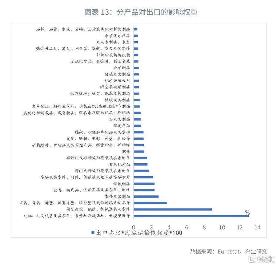 綜上,各行業因出口產品特徵及運輸方式差異,運費上漲對其影響不一。據此,本文結合該行業出口權重及運輸方式兩個維度,分析運費上漲帶來的壓力。具體計算方式為:該行業出口權重與對海運出口依賴度比重的乘積,該指標越大,意味着運費上漲對該行業的影響在我國整體出口的權重越高。計算結果顯示(參見圖表13):