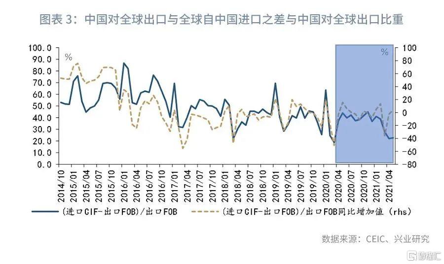 理論上,我們可用出口FOB價與進口CIF價軋出我國出口貨物所用運費。 需要指出的是,受轉口貿易、統計時間點、匯率結算時間點不一致等影響,二者差值並不完全等同於運費。本文用IMF統計的中國對全球離岸出口價格與全球自中國進口到岸價格數據作差,軋出中國出口產品的運費。