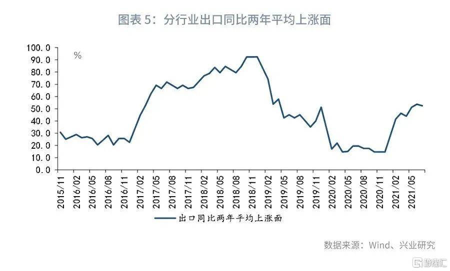 需要指出的是,與運價飆升相比,運費與出口總值比重相對較為穩定。這或主要是由於出口結構性分化所致。在疫情期間,單位價值高而體積小的貨物出口表現好於單位價值低而體積大的貨物。最為典型的是,與疫情相關的計算機通信及醫藥行業出口高增長(圖表4),而其他出口附加值低但體積大的產品增長低迷。2020年我國出口呈少數產品貢獻多數增長的特徵,以兩年平均增速來看,截至2020年12月,僅有14.6%的行業出口兩年平均增速高於去年兩年平均,參見圖表5。