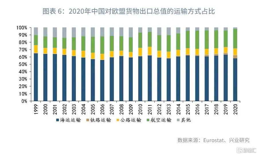 按照運輸工具劃分,目前國際貿易運輸方式主要有海運運輸、鐵路運輸、公路運輸、航空運輸等。目前,我國出口高度依賴海運運輸。以我國對歐盟出口運輸方式為例,2020年我國對歐盟海運運輸出口占我國對歐盟出口總值的58.2%,隨後依次為航空運輸(26.5%),公路運輸(9.3%)和鐵路運輸(4.2%),參見圖表6。