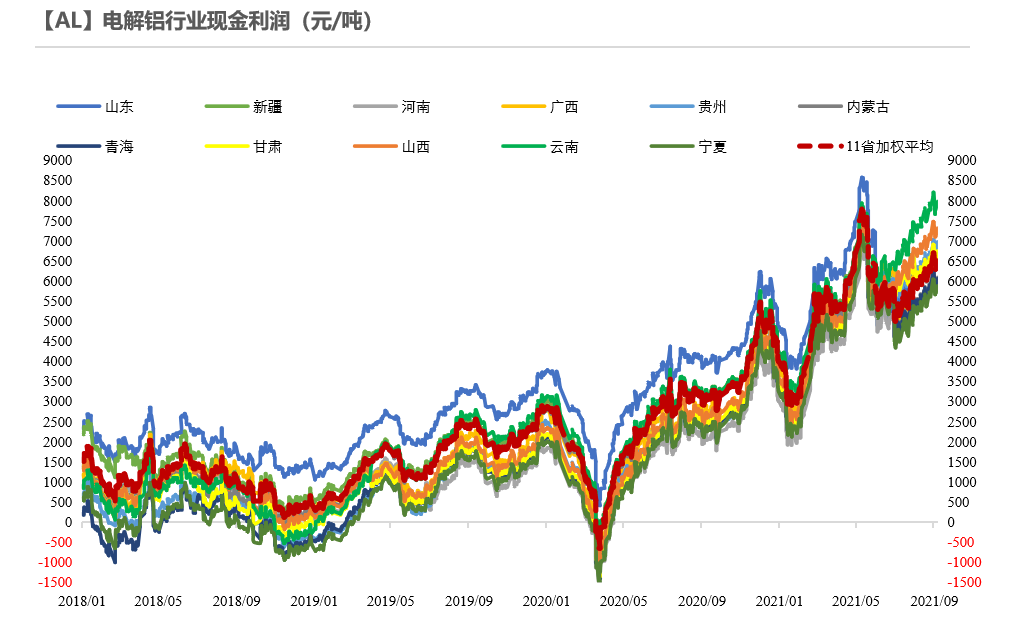 近期氧化鋁、電力成本同步擡升,電解鋁行業現金成本達到15000元/噸以上,全國加權平均現金利潤約6500元/噸。