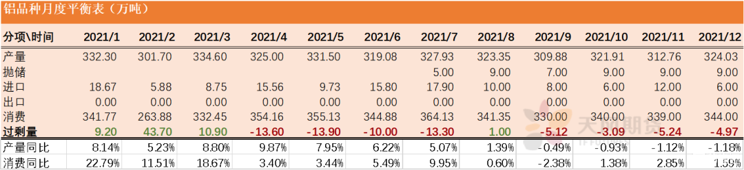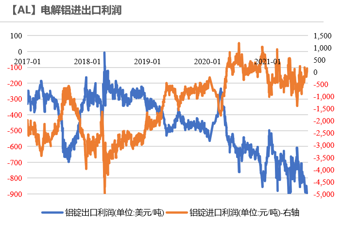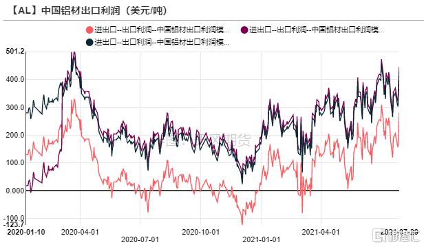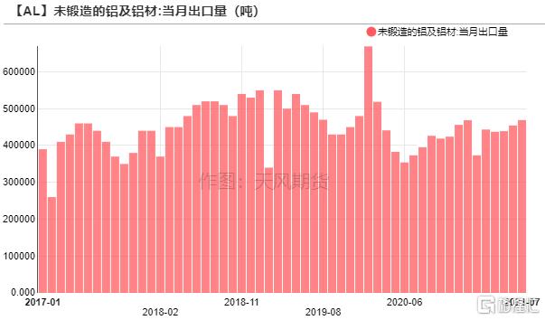 2021年7月,未鍛軋鋁及鋁材出口46.9萬噸,1-7月累計出口308.5萬噸,累計同比增長12.7%。隨着海外經濟回暖,對鋁材需求明顯走強,但是集裝箱短缺、海運費高企等因素抑制出口訂單,以及國際貿易摩擦頻發,導致出口量難以大增,月均出口量預計維持在45萬噸的水平。
