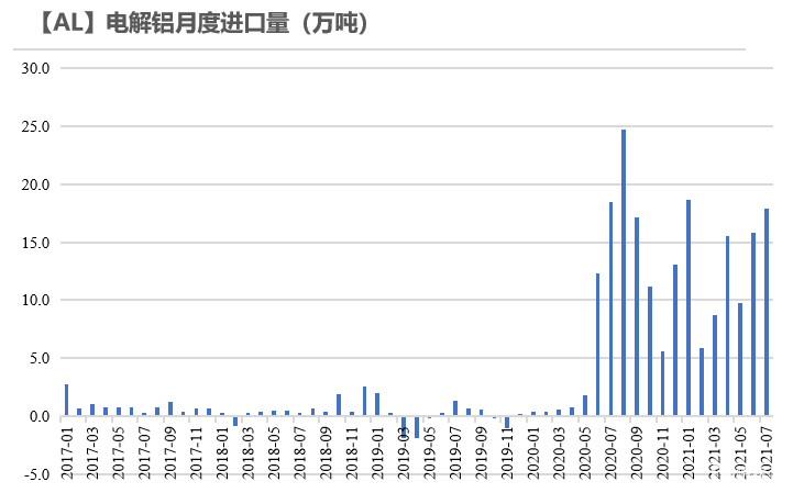 2021年7月,電解鋁進口17.9萬噸,環比增長13.29%。分國別來看,自印度和俄羅斯分別進口10.53萬噸和3.38萬噸,佔比59%和19%。1-7月國內累計進口92.18萬噸,累計同比增長165.86%。