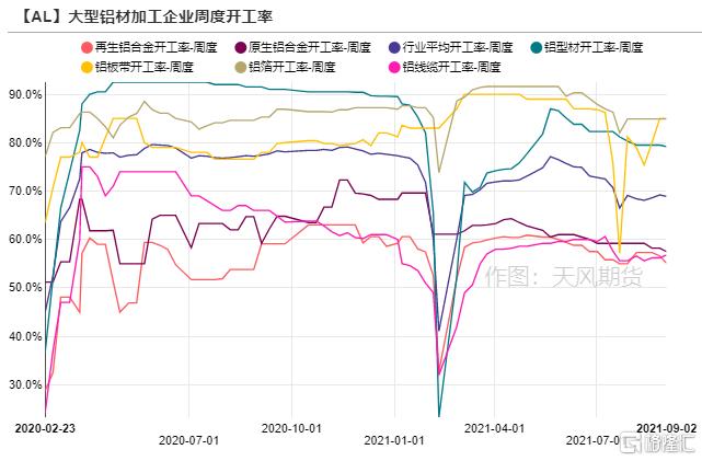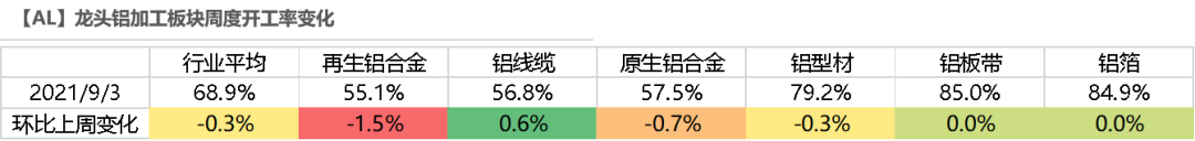 上週,龍頭鋁加工企業周度開工率小幅下降0.3%至68.9%。分類型來看,由於山東環保督察,當地再生鋁廠停產,再生鋁合金開工率下降1.5%。由於硅和鎂等中間合金的價格大漲,導致原生鋁合金企業成本大增,虧損範圍擴大,開工率下降0.7個%。鋁線纜開工環比增長0.6%,江蘇某企業九月份交貨訂單比較集中,企業略有增產,其他企業排產基本持穩。