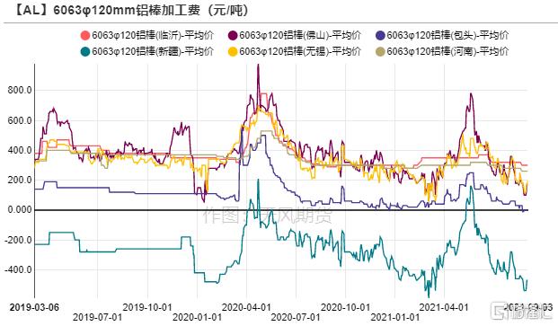 鋁棒庫存積累1.46萬噸至13.9萬噸,型材需求萎靡,採購商畏高情緒再起,接貨有限。由於硅、鎂等原材料大幅漲價,近日山東、內蒙古多家鋁棒廠對外宣已上調鋁棒加工費,其中6063加工費上調150元/噸,6061上調350元/噸。