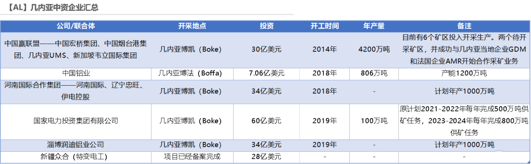 (1)國內格局。2020年我國進口鋁土礦11157萬噸,其中5267萬噸來自幾內亞,佔比達到47%,位居第一。幾內亞礦石是高鋁低硅型三水鋁石,品位高、相對易開採。目前中國在幾內亞投資鋁土礦項目的企業,主要爲贏聯盟、中鋁、河南國際、國電投、淄博潤迪鋁業、新疆衆和這6家企業。