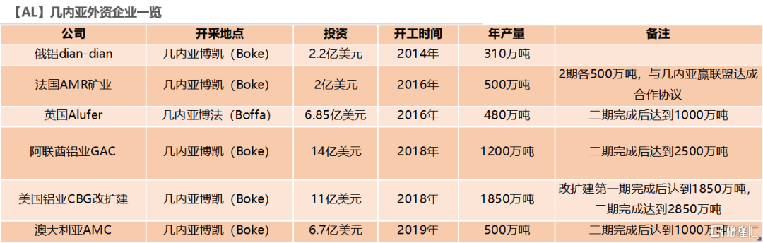 (2)海外格局。海外龍頭鋁企在幾內亞佈局的也不在少數,其中包括俄鋁、美鋁、EGA、Alufer等鋁企,投資體量不亞於中國鋁企,年產量合計接近5000萬噸,政治局勢動盪對海外礦石供應影響也不容小覷。