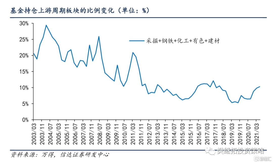 一方面,去年以來商品價格的累計漲幅高於2016年-2017年,但機構投資者配置週期板塊的倉位僅僅與那段時間持平,大部分週期行業的估值也只略高於2017年。