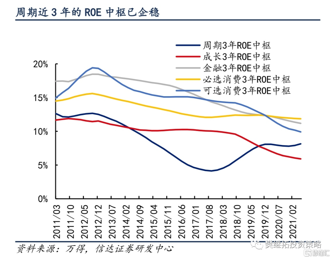 另一方面,目前週期板塊的產業邏輯和盈利情況是好於2016年-2017年的。第一,2016年-2017年週期股上漲的主要邏輯是供給側改革帶來的商品價格上漲,但本輪週期股出現了以新能源車為代表的成長性需求。當然,新能源車需求雖然增速高,但需求體量相較傳統的需求體量來説不算大,所以對週期板塊盈利增速的貢獻不算大。至少週期板塊的盈利增速是無法和十年前相比的。第二,更為重要的一點是, 2017年之後,很多週期股的利潤增速波動下降,ROE中樞企穩。也就是説很多週期性企業是在持續賺錢的,這個持續賺錢的邏輯只有產能大量釋放才會被打破,當前出現這種情況的概率不大。