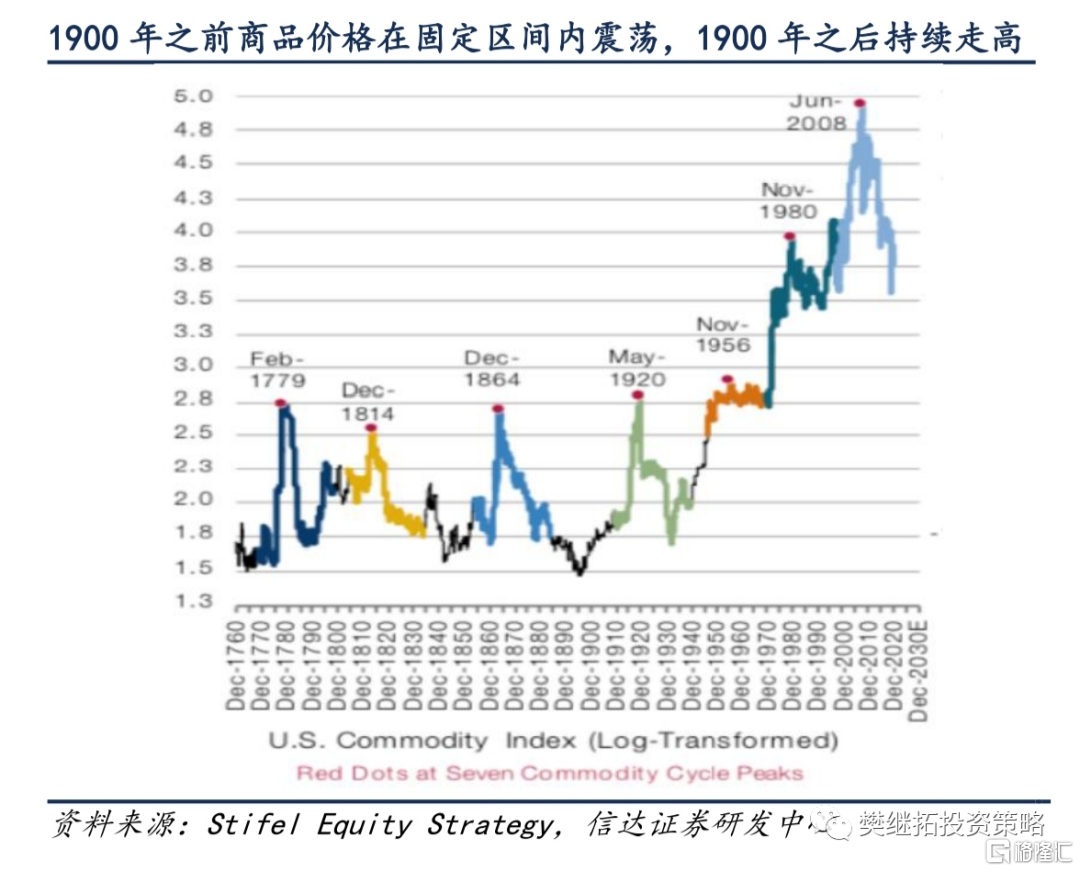 但如果我們將歷史時間區間拉長到200年,就會得到不一樣的結論。在1900年之前,也就是黃金、白銀以及其他工業品本身就是貨幣的年代,商品的價格從未出現過中樞性的抬升,一直在固定的區間內震盪。但是1900年之後,全球化程度重大發展,英鎊美元等貨幣成為了重要的信用貨幣,商品的價格幾乎每隔幾十年都會出現一次系統性的中樞抬升。這一現象反映的邏輯是,貨幣發行速度遠遠超過經濟增長速度,也遠遠超過了商品供需的增長速度,所以商品價格與貨幣的比價會持續走高。而比價的每一次劇烈抬升並不只反映當年的供需缺口情況,而是對於過去十多年貨幣超發的累積影響的一次性計價。