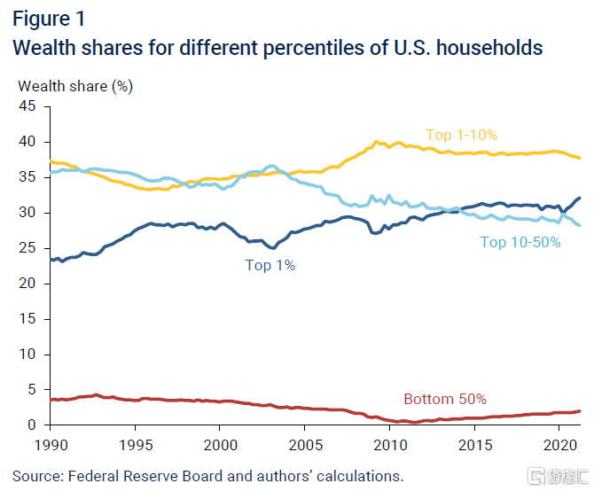 在美國財富的分佈歷來是不均衡的,過去三十年裏財富分佈的不平等程度進一步加劇。這些變化是伴隨生產力增長放緩和人口結構轉變發生的,導致利率水平持續承壓,同時資產估值不斷上升。(美國家庭)財富總額在2010年初爲60.5萬億美元,到2021年初翻了逾一番,達到129.5萬億美元。頂層1%家庭和底層50%家庭的財富份額都有增加,儘管完全不成比例。財富分佈、特別是頂層的財富分佈,在過去三十年裏也發生了變化,主要是緣於資產價格而非經通脹調整後收入。因此,財富分佈與收入分佈的分歧逐步擴大直至脫鉤。