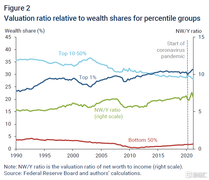 爲了說明財富分佈如何與資產估值一起變動,圖2展示了家庭資產淨值相對於可支配收入的估值比率(綠線)。這個資產淨值/收入 (NW/Y) 比率衡量了給定時間的資產估值水平,定義爲家庭資產扣除負債後除以個人可支配收入。該比率反映了範圍廣泛的一系列資產的估值,包括債券、股票和房產,按家庭持倉的比例加權計算。NW/Y比率的功能類似於市盈率 (P/E),但它使用的是家庭數據,資產的市場價值對應市價P,而可支配收入對應盈利E。