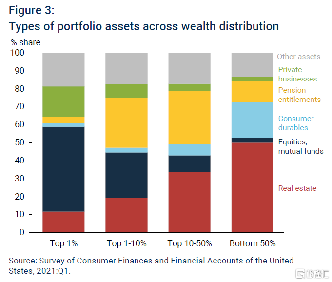 爲了確定財富分佈演變的潛在驅動因素,我們根據2021年一季度的最新數據,調查了各羣體的總投資組合持倉構成(見圖3)。投資組合按股票和房產持倉、養老金以及其他成分來細分資產類型。
