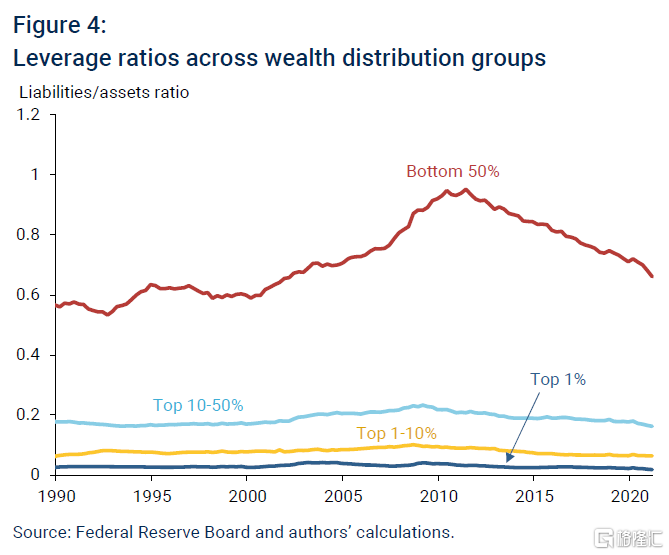 房產尤其需要大量債務提供融資。因此,雖然底層家庭房產的投資組合份額上升,但他們的負債也在上升。由於在房地產繁榮時期,底層50%家庭的資產和負債都在擴張,他們的財富或淨值相對保持不變。