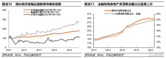 (3)商品房市場機制下,房價在近二十年保持高速增長,遠超其他資產類別,產生了巨大的虹吸效應,在一定程度上加劇貧富分化,提升了居民住房成本。2005年以來,全國房價年均漲幅大約為7.39%,表現與股票和債券價格指數的對比描述。2012年以來,房地產貸款(包括按揭貸和開發貸,不包括非標)在信貸中的佔比穩步提升,佔據了大量的金融資源。此外,央行課題組發佈的《2019年中國城鎮居民家庭資產負債情況調查》顯示,房地產是居民投資的最重要選擇,在城鎮居民家庭財富中的佔比達到七成。