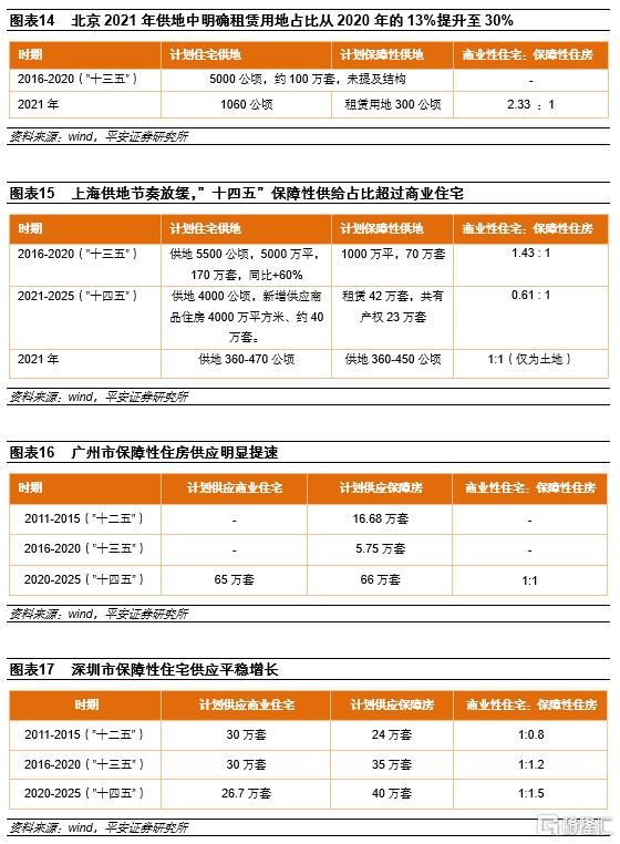 前文所述,城市新市民的住房需求應該在1-1.5億人次,假設其中70%需要由租賃來滿足,需要提供7000萬-1億人次的租賃保障房供給。70平方米小户型,一般能夠供給3個單身青年居住,意味着需要2500-3500萬套租賃保障房,這個數據接近城鎮存量住宅的7%-10%。參照新加坡的進展,假設用5年左右基本滿足這類人羣的租房需求,年均供給保障房在500-700萬套左右,基本與2008-2020年中國年均建設保障類住房的650萬套的供給速度持平。我們發現北京、上海、深圳、廣州等一線城市”十四五”規劃中的保障房供給節奏在大幅加快,實現城市新市民住有所居這個目標在5年內完成的概率較高。