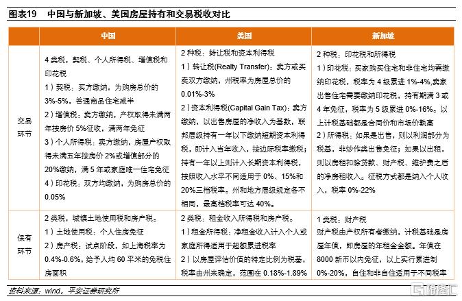 我國針對交易環節的徵税相對美國、新加坡已經相對較高。國內買賣房屋涉及契税、個人所得税、增值税和印花税,其中前三者的税率較高,契税及印花税約為3%-5%,增值税按照房價的2%或者增值部分20%徵收(滿五或唯一住房減免),整體交易環節最高税負約為房價的12%;美國涉及轉讓税和資本利得税,利得税的税率更高,最高可為增值部分的40%;新加坡交易徵收印花税和所得税,印花税為房價的0%-16%,出售或出租房屋所的納入個税體系。税率為0%-22%。