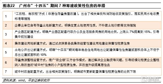 當前的政策增加保障性住房的重點在於存量,將其中一部分改成保障性住房,新增土地供應仍然以當前的市場化招拍掛為主,由市場化的開發商參與為主。以廣州為例:《廣州市住房發展“十四五”規劃》提出“十四五”期間,力爭供應新建商品住房65萬套;籌建政策性住房66萬套,即政策性住房與商品住房的比例基本為1:1。66萬套政策性住房以7種方式籌建,新增土地供應並不是主要的方式:新增住宅用地供應計劃中,保障性住房用地是不少於208公頃,商品房用地不少於2000公頃,比例是10:1。