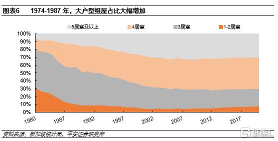 第三階段(1974年-1987年):從剛需到改善。這一階段政策錨定中等收入羣體提供大户型組屋。1974年國營房屋與城市開發公司(HUDC)成立,專門面向中等收入家庭建設面積約為139-158平方米的大户型組屋(四、五房式)。同時放寬組屋購買條件,凡家庭月收入在12000新元(多代家庭為18000新元)以下者均可購買,以滿足更多中等收入家庭住房需求。