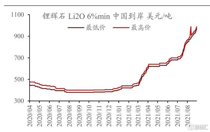 上海有色網數據顯示,截至9月14日,鋰輝石精礦均價為1005美元/噸,環比上月同期上漲21%,年初至今累計上漲超140%。