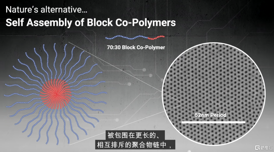 除了成本之外,傳統的自上而下的光刻模式正日益受到感光材料對光反應的固有問題的挑戰,如隨機打印失敗和線邊/線寬粗糙度(LER/LWR)。而定向自組裝(DSA)技術被認爲是一種革新的、更具成本效益的製造方法,它是採用自下而上的模式。作爲補充和進一步擴展基於光刻的模式的潛在途徑。