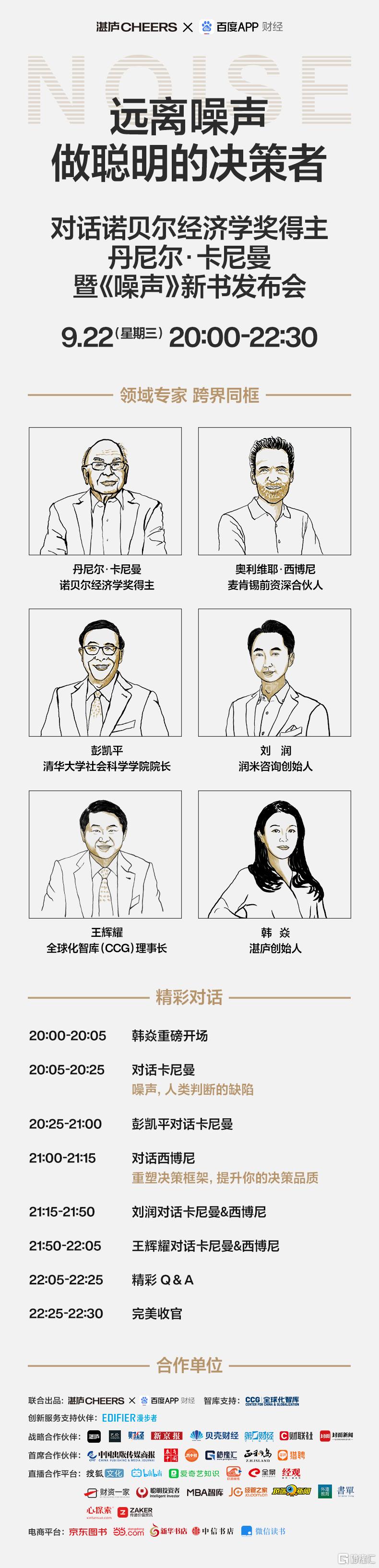正值新書出版之際,9月22日,湛廬文化與百度財經隆重舉辦線上高端論壇,對話諾貝爾經濟學獎得主丹尼爾·卡尼曼,與麥肯錫前資深合夥人奧利維耶·西博尼、國內知名心理學家、商業專家等展開深度對話與智慧碰撞,分享“噪聲”帶來的啟迪與思考。