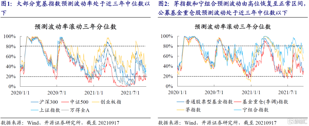 截至上週五(20210917),大部分寬基指數預測波動率處於近三年中位數以下,排序上創業板>滬深300>上證指數>萬得全A>中證500。機構持倉較多的板塊中,茅指數和寧組合預測波動率從8月的高位回落,分別處於近三年51%和66%分位。公募基金重倉股整體的預測波動率處於近三年較低位,普通股票型基金指數和基金重倉(季調)指數預測波動率分別位於36%和27%分位。