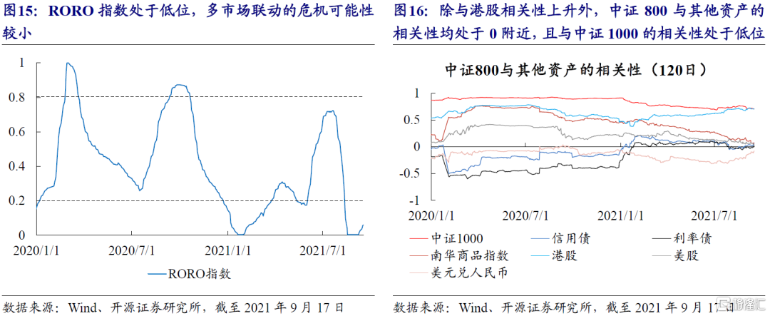 截至上週五(20210917),RORO指數處於6%分位的低位,多市場聯動的危機可能性較小。值得注意的是,2021年以來,除了和港股相關性上升外,A股和其他資產間的相關性都縮小到0附近,且內部相關性也有所降低,例如中證800與中證1000的相關性降低到71%。