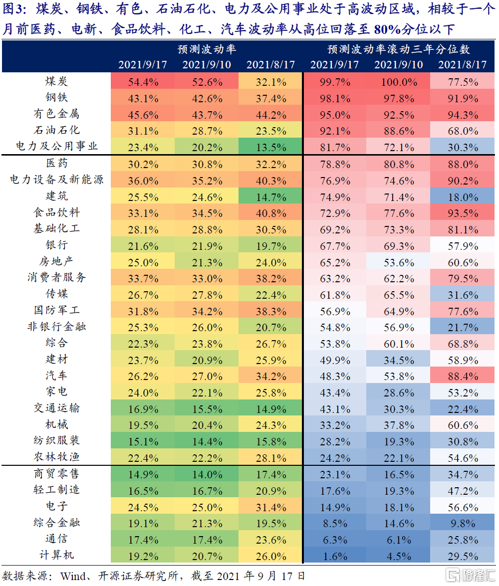行業層面上,部分週期行業如煤炭、鋼鐵、有色、石油石化、電力及公用事業處於高波動區域,商貿零售、輕工製造、電子、綜合金融、通信、計算機處於較低波動區域,相較於一個月前醫藥、電新、食品飲料、化工、汽車波動率從高位回落至80%分位以下,但醫藥、電新、食品飲料波動率仍處於近三年前70%分位。