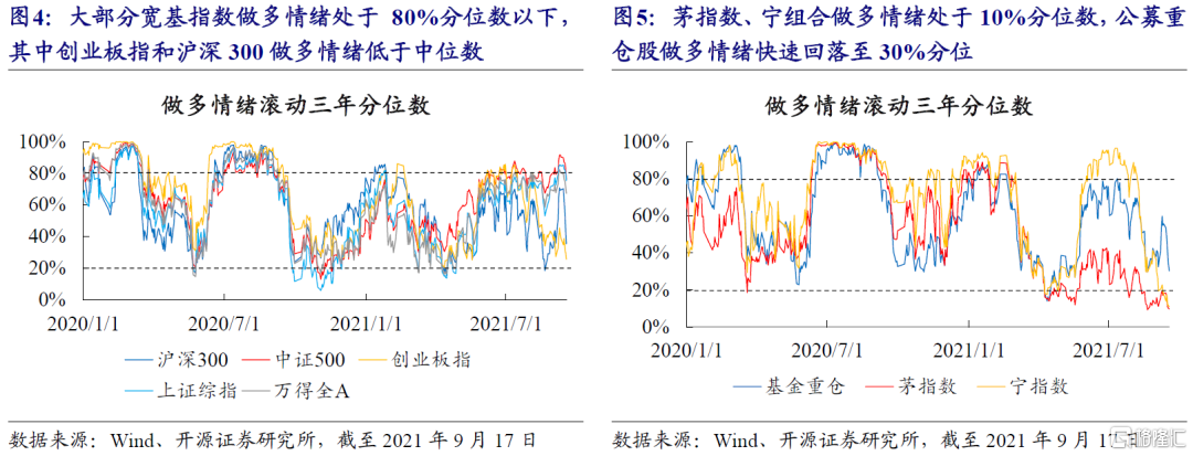 截至上週五(20210917),大部分寬基指數做多情緒處於近三年80%分位數以下,其中創業板指和滬深300做多情緒低於中位數,排序上中證500>上證指數>萬得全A>滬深300>創業板指。機構持倉較多的板塊中,寧組合做多情緒從8月初的高位回落,處於近三年10%分位;茅指數做多情緒持續處於低位,也處於近三年10%分位。公募基金重倉股整體的做多情緒在近一週(20210913-20210917)市場調整中回到30%分位