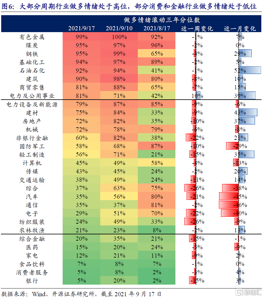 分行業看,截至上週五(20210917)大部分週期行業和電力設備及新能源做多情緒處於高位,有色、煤炭、鋼鐵、化工、石油石化、建築和電力及公用事業做多情緒高於近三年80%分位數,電新板塊做多情緒也處於近三年79%分位;部分消費和金融行業做多情緒處於低位,醫藥、家電、食品飲料、消費者服務、綜合金融和銀行做多情緒低於近三年20%分位數。從時序變化上來看,上週(20210913-20210917)除電力及公用事業外行業做多情緒普遍回落,除綜合外汽車、電子、非銀金融、紡織服裝分位數下滑幅度超過20%。近一個月(20210818-20210917)做多情緒分位數上升幅度最大的前五個行業爲石油石化、建材、電力及公用事業、房地產和輕工製造,以週期行業爲主,除綜合外做多情緒分位數下降幅度最大的前五個行業爲計算機、國防軍工、電子、汽車、通信,以TMT板塊爲主。