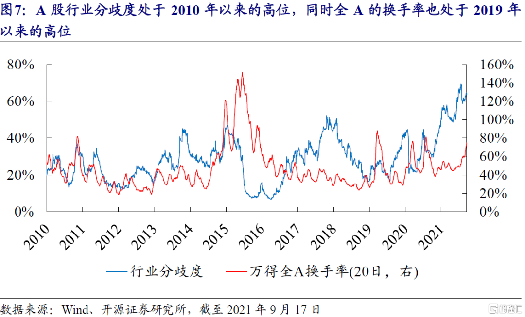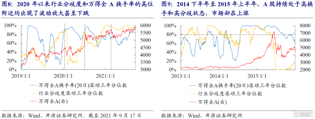 截至上週五(20210917),A股行業分歧度處於2010年以來的高位,同時全A的換手率也處於2019年以來的高位。即使考慮高頻量化基金造成換手率的“膨脹”,對萬得全A的換手率打7折,全A的換手率也處於近三年的75%分位數。從近期的歷史來看,換手率和行業分歧度雙高意味着調整的風險,但長期來看並不必然。例如2020年以來行業分歧度和萬得全A換手率的高位附近均出現了市場波動放大甚至下跌,但在2014年下半年至2015年上半年期間,A股持續處於高換手和高分歧狀態,市場卻在上漲。“雙高”市場的走向需關注基本面和金融環境的變化