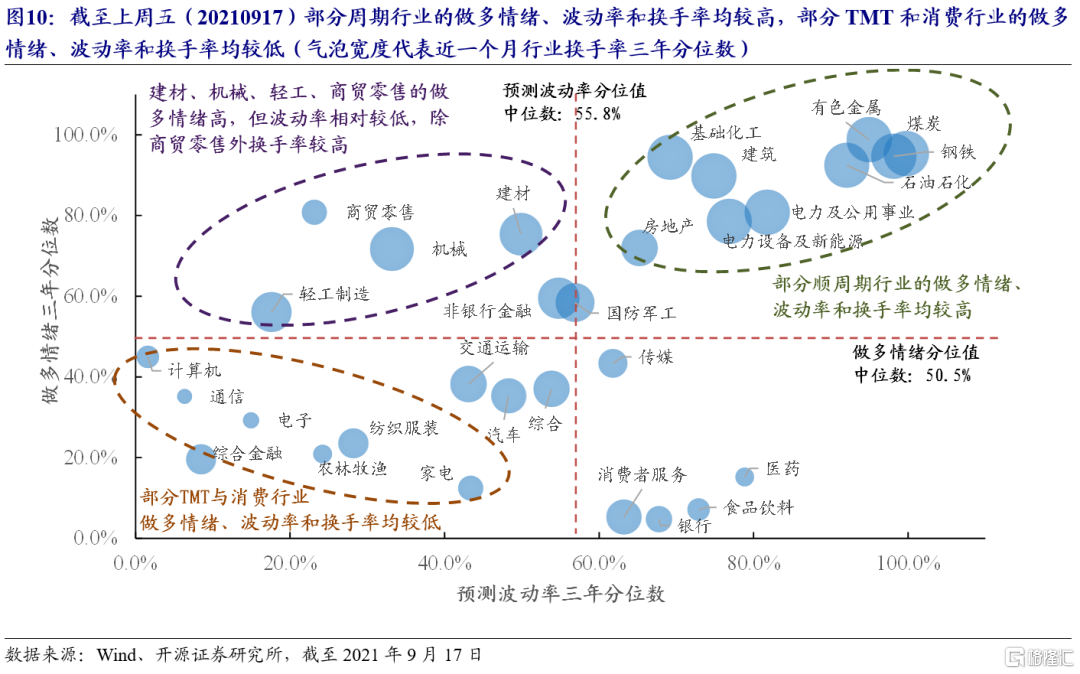 綜合來看,近期全市場和行業分歧雙高的原因主要來源於週期行業的做多情緒較高,截至上週五(20210917)煤炭、鋼鐵、有色、石油石化、化工、建築、電力、房地產等週期行業,以及電力設備及新能源的做多情緒、波動率及換手率均處於近三年來較高水平;建材、機械、輕工和商貿零售做多情緒高,但波動率相對較低,其中商貿零售換手率較低。與此形成對比的是,計算機、通信、電子等TMT行業,以及農林牧漁、紡織服裝、家電等消費行業做多情緒、波動率和換手率均較低。