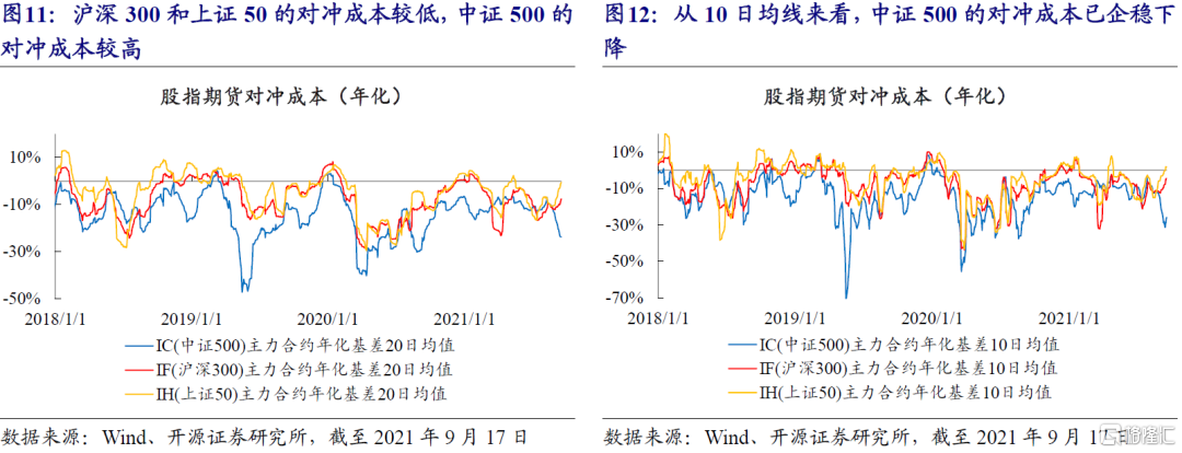 截至上週五(20210917),滬深300和上證50的對衝成本較低,20日平均年化基差分別爲-8%和-1%,中證500的對衝成本較高,20日平均年化基差爲-24%。從10日均線來看,中證500的對衝成本已企穩下降,滬深300和上證50的對衝成本自8月下旬以來持續走低,投資者情緒總體樂觀且偏向大市值