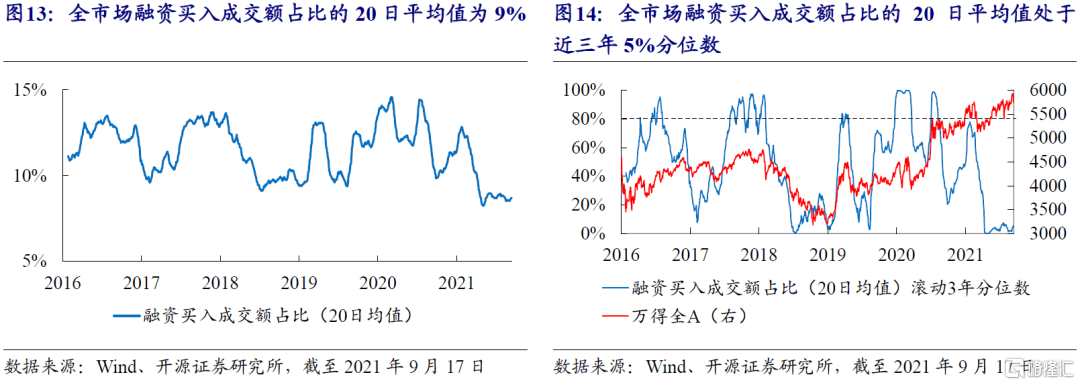 2016年以來,融資買入的成交額在較爲穩定的區域內波動,平均佔比爲11.5%。當融資買入的成交額佔比處於高位時,市場通常也處於局部高點。截至上週五(20210917),全市場融資買入成交額佔比的20日平均值爲9%,處於近3年來5%的低分位水平