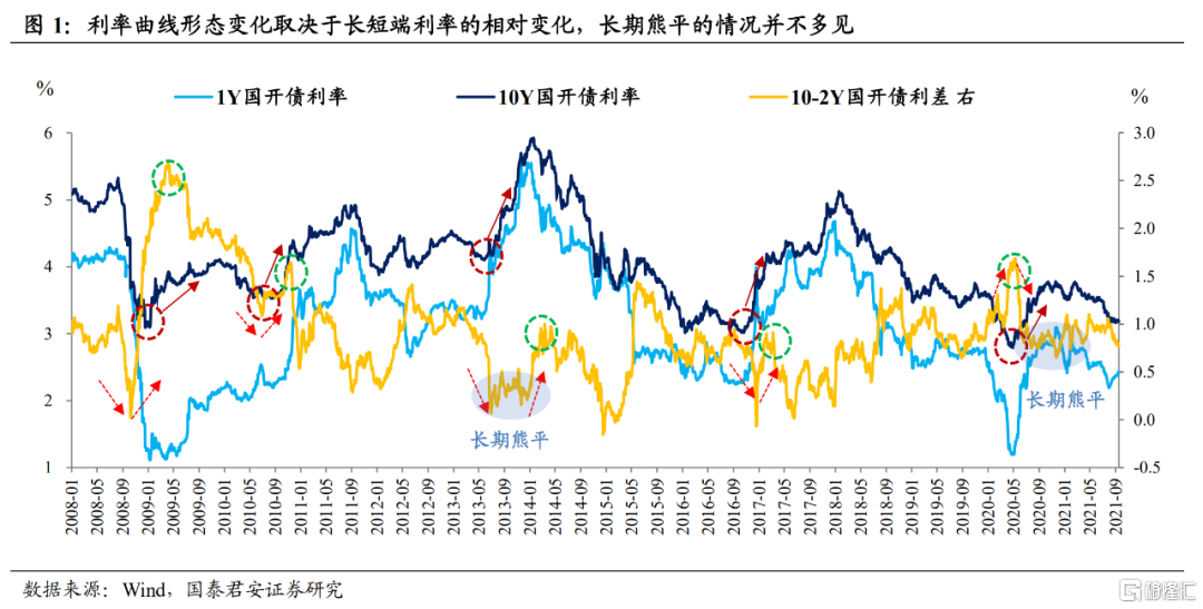 貨幣政策從“逆週期調節”轉變爲“跨週期調節”,過去通過曲線調控的思路發生轉變。疫情影響下,經濟衰退和復甦週期持續時間都更短,2020年5-11月長端利率還在按照以往的思維緩慢上行;但貨幣政策提前收緊,讓市場有經濟過熱的“錯覺”,資金面持續緊平衡,短端利率上行幅度更大,並持續到11月永煤放水,明確的寬鬆信號出現,纔打破“熊平”狀態。