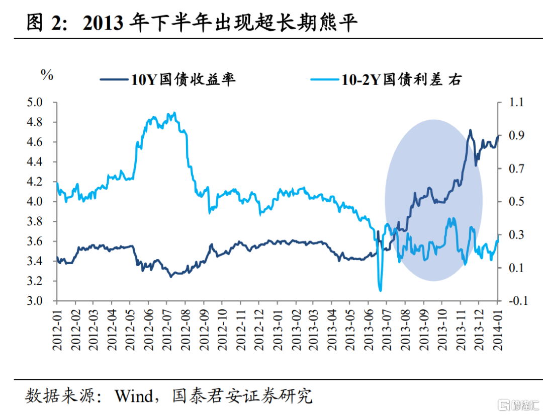從歷史經驗來看,僅2013年符合曲線先熊平、後熊陡的情況,且熊平持續時間長達半年。2013年下半年經濟復甦跡象初顯,但由於“620錢荒”央行遲遲沒有出手,短端利率極度敏感,帶動期限利差收窄;隨後8月3日央行二季度貨幣政策執行報告,公佈3年期中票到期續作被凍結,疊加7月工業增加值(9.7%)超預期回升,雙重利空衝擊,市場對貨幣政策持續收緊的擔憂升溫,利差繼續收窄;等到9-10月基本面繼續改善、而央行公開市場操作卻時常缺位時,貨幣政策的“捉摸不定”的擔憂幾乎達到頂峯,期限利差也繼續維持在低位。