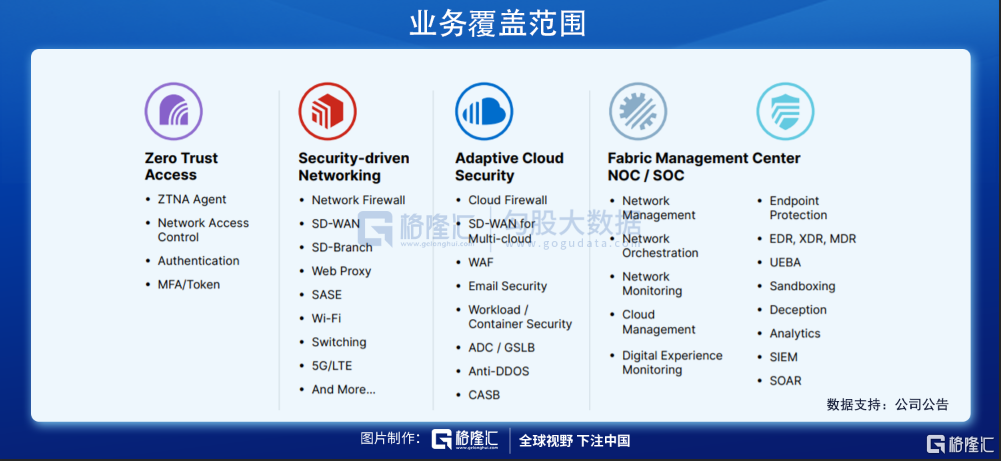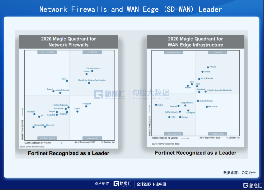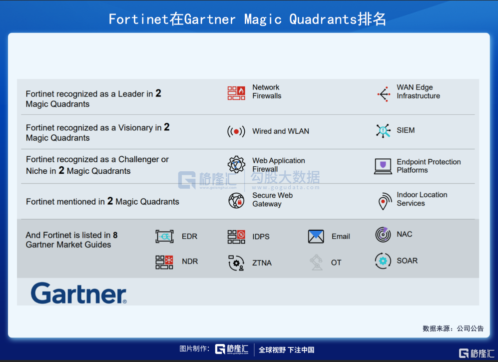 根據SaaS行業權威諮詢機構Gartner的統計,Fortinet入選8大市場指南,覆蓋EDR、NDR、IDPS、ZTNA、Email、OT、NAC、SOAR,並在專攻的網絡防火牆和廣域網邊緣領域做到領先地位。我們認爲其競爭力核心在於: