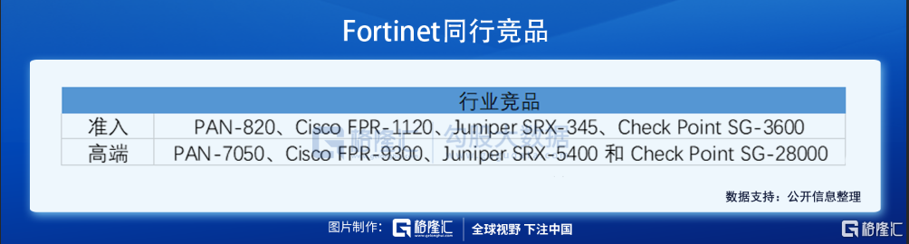 在衆多網絡安全公司中間,Fortinet的競爭對手包括Barracuda、Check Point、Cisco、CrowdStrike、F5Networks、FireEye、Forcepoint、Imperva、Juniper、McAfee、Palo Alto Networks、Proofpoint、SonicWALL、Sophos、TrendMicro和Zscaler。
