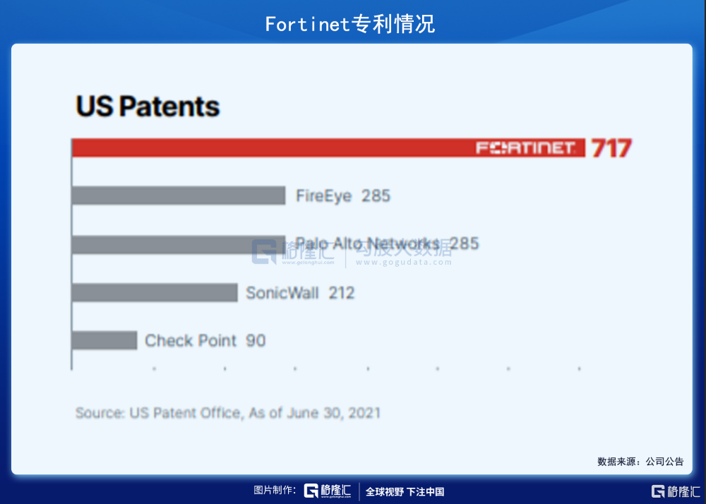 截至21年7月30日,Fortinet專利總數達到785項,另外尚待審批專利數量(220項)就與同類網絡安全公司(均值爲218)相當,已通過的美國的專利(717項)則接近3倍。