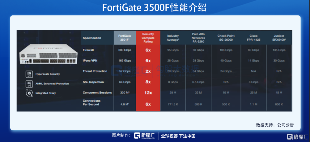 相較於FG200F(2) 和FG4000F(2),FG 3500F聚焦超大規模安全,AI/ML增強保護,以及集成代理。數據佐證,在防火牆、SSL檢測和並行會話方面,FG 3500F分別達到行業的6x、8x和12x,實現性能的進一步突破。由此判斷Fortinet在網絡防火牆和廣域網邊緣領域將保持競爭優勢,護城河加深。