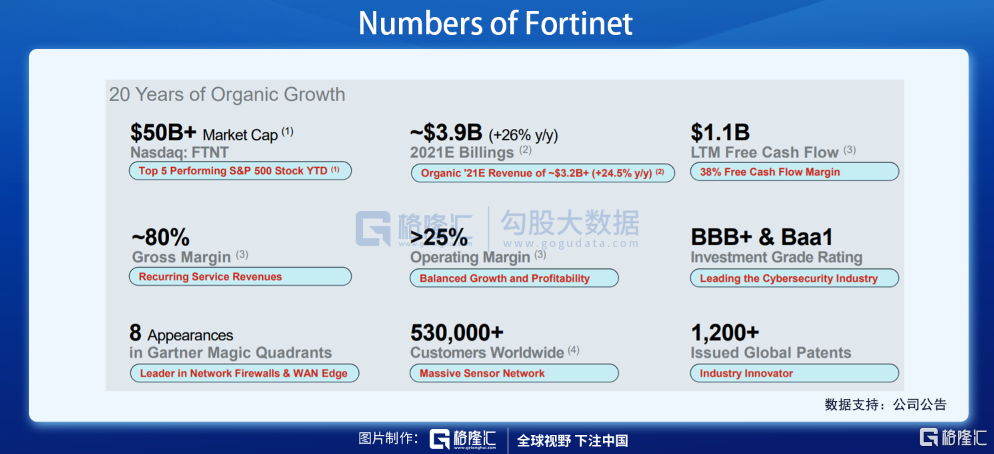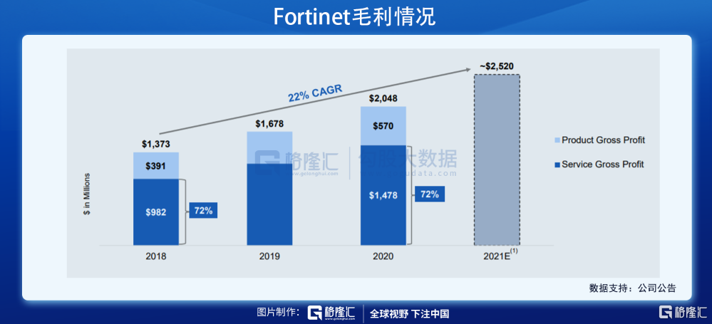 Billings在2021年加速至同比增長26%,2018~2021四年的年複合增長率CAGR達到22%,服務Billings約佔總Billings的 70%。對於非FortiGate的業務,公司安全戰略的核心,Fortinet Security Fabric,四年CAGR增速達到37%,遠超總體的22%的增長。這佐證了Fortinet在網安賽道的成長能力。預計非FortiGate平臺今年的業務規模將達到10億美元。