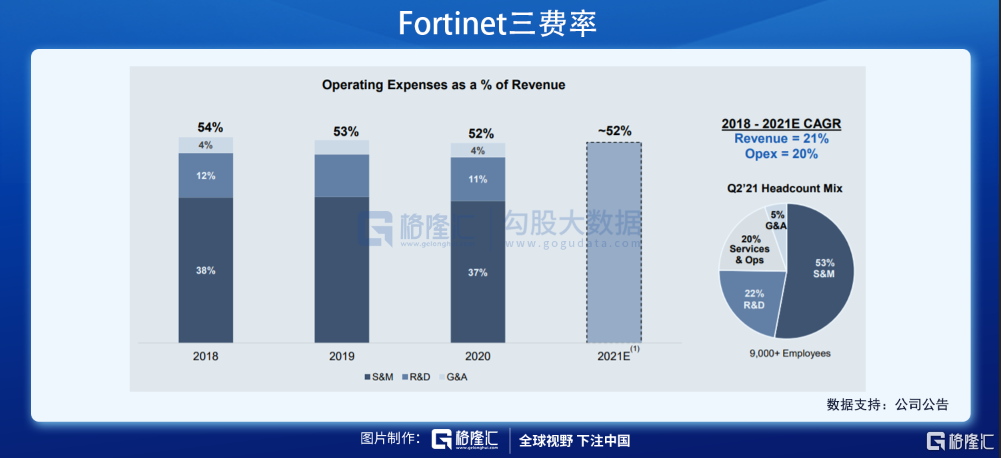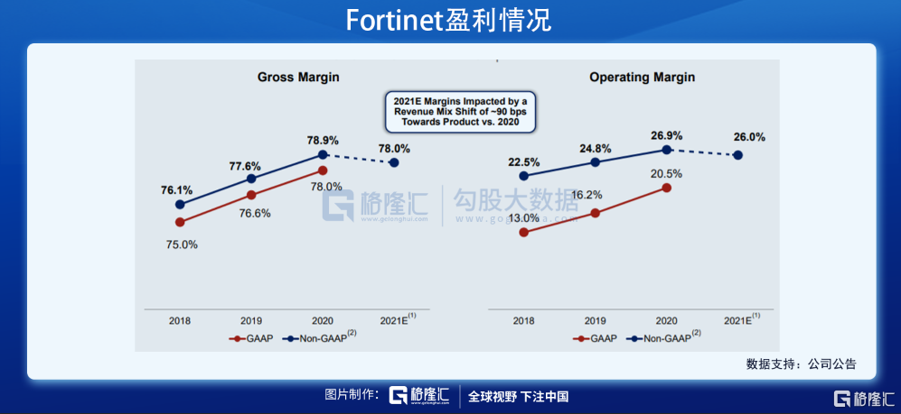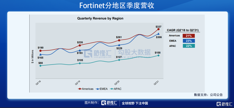 不過,與更新的傳統防火牆不同的是,由於網絡安全的需求及其服務形式取決於IT基礎架構變化,網安與雲業務緊密聯合,Fortinet近兩年不斷髮力在更新和擴大基礎設施。這樣無論是傳統防火牆能夠覆蓋的區域,又或是在一些運行場景(安全廣域網,5G和內部環境)中間,後者不可分辨的內部攻擊,都能夠得到保護。更重要的是,基於高於同行競爭者6倍的性能優勢,收入渠道拓寬,產品收入增長的較小概率因爲疫情恢復而下降。