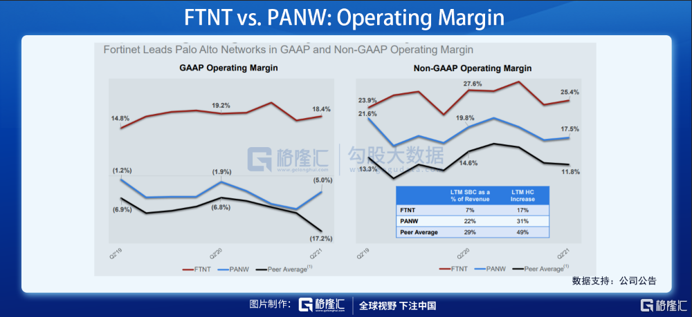 不考慮成長性,FTNT在盈利方面也遠超於PANW(GAAP,23.4%;Non-GAAP,7.9%)和行業均值。