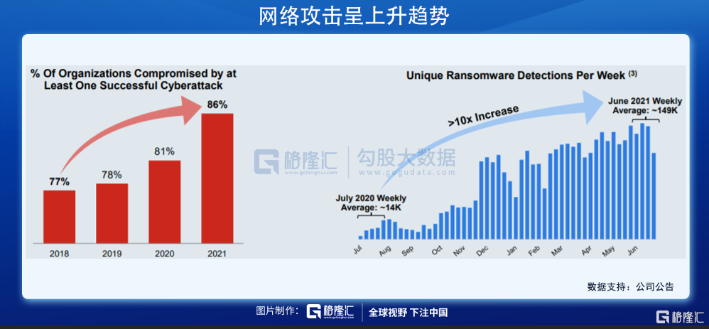 21年,至少遭受一次網絡攻擊的企業百分比已從2018年的77%攀升至21年的86%,且疫情以來呈加速上升的趨勢。更緊急的是,勒索檢測需求的頻率正指數級增長,一年時間內,每週監測次數已由14k次翻10倍達到149k次。