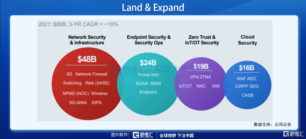 Land於480億美元空間的網絡安全與基礎設施,FTNF同時向端點安全和安全開發、零信任與IoT/OT安全,以及雲安全領域expand。2021年可尋址市場達到800億美元,年複合增長率保持10%,預計市場規模在2024年達到千億美元的級別。