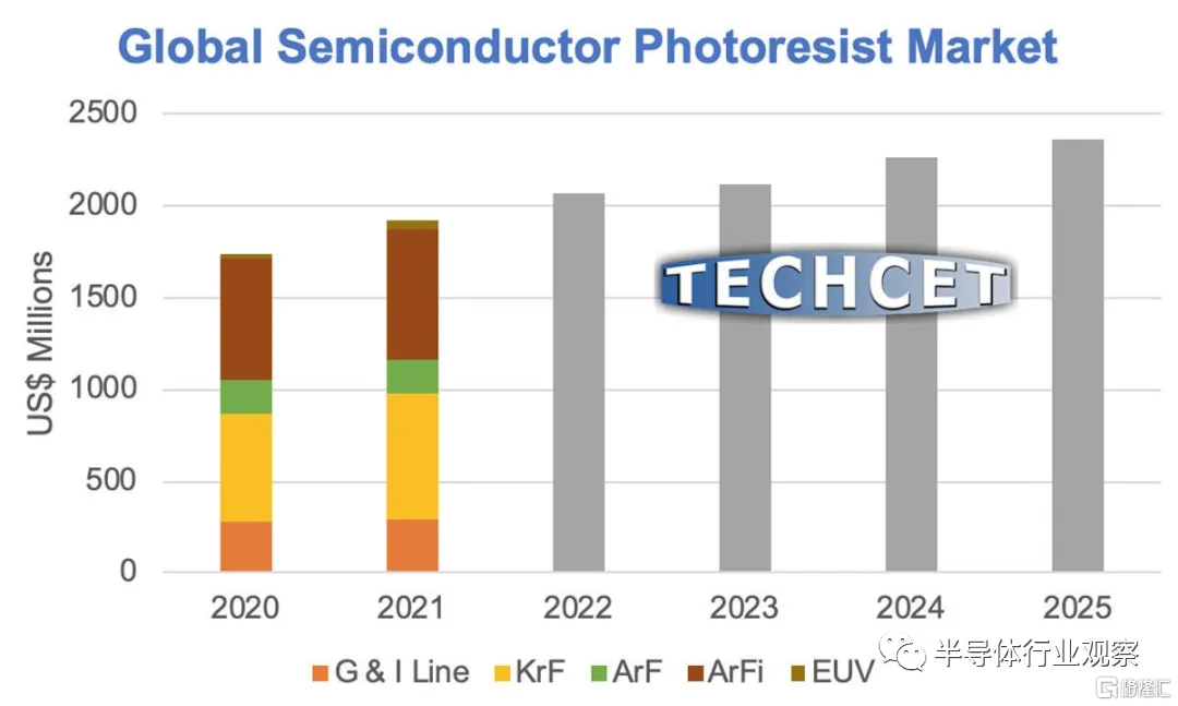 作為芯片生產不可或缺的一種原材料,與5000億美元的半導體市場相比,光刻膠的市場規模並不大。據TECHCET發佈最新統計和預測數據:2021年,半導體制造所需的光刻膠市場規模將同比增長11%,達到19億美元。