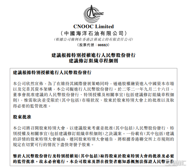 9月26日晚間,中國海洋石油有限公司(以下簡稱“中海油”)(0883.HK)發佈公告稱,公司擬申請A股發行上市。